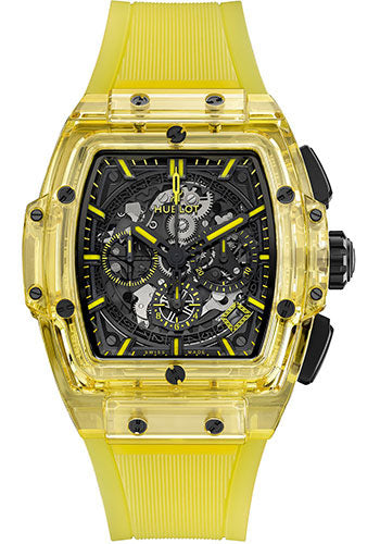 42 mm polished yellow sapphire crystal case, polished yellow sapphire crystal bezel with 6 H-shaped black-plated titanium screws, sapphire crystal with anti-reflective treatment, sapphire crystal dial, HUB4700 self-winding movement with chronograph, approximately 50 hours of power reserve, transparent yellow structured lined rubber strap, black-plated titanium deployant buckle. Water resistant to 50 meters.