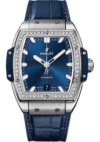 39 mm satin-finished and polished titanium case, polished titanium bezel set with 50 diamonds for ~1.0ct, 6 H-shaped titanium screws, sapphire crystal with anti-reflective treatment, satin-finished blue sunray dial, HUB1710 self-winding movement, approximately 50 hours of power reserve, blue rubber and alligator strap, stainless steel deployant buckle. Water resistant to 100m (10 ATM).